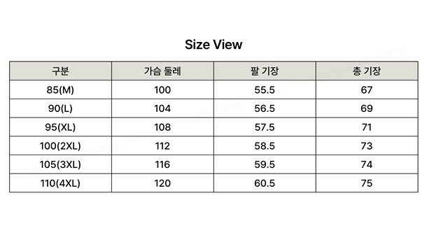 85(M),90(L),95(XL),100(2XL),105(3XL),110(4XL)